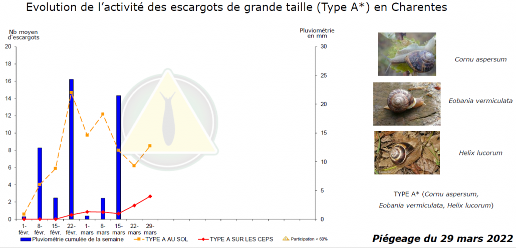 L’activité des escargots au sol se renforce également. Voyez les relevés réalisés en Charente, qui sont éloquents quant ’à leur regain d’activité.