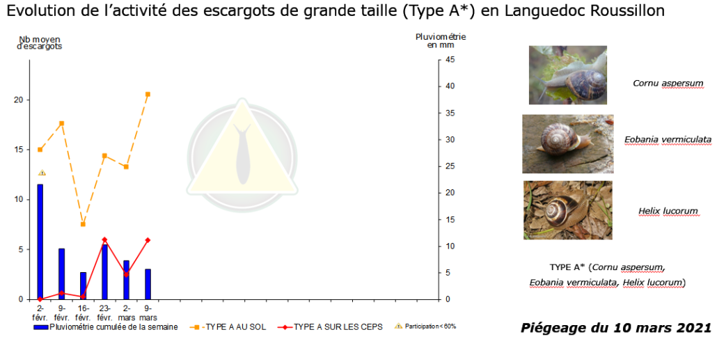 Les piégeurs de l’Observatoire vigne du Sud-Est constatent une explosion du nombre d’escargots sous les pièges et sur les ceps.