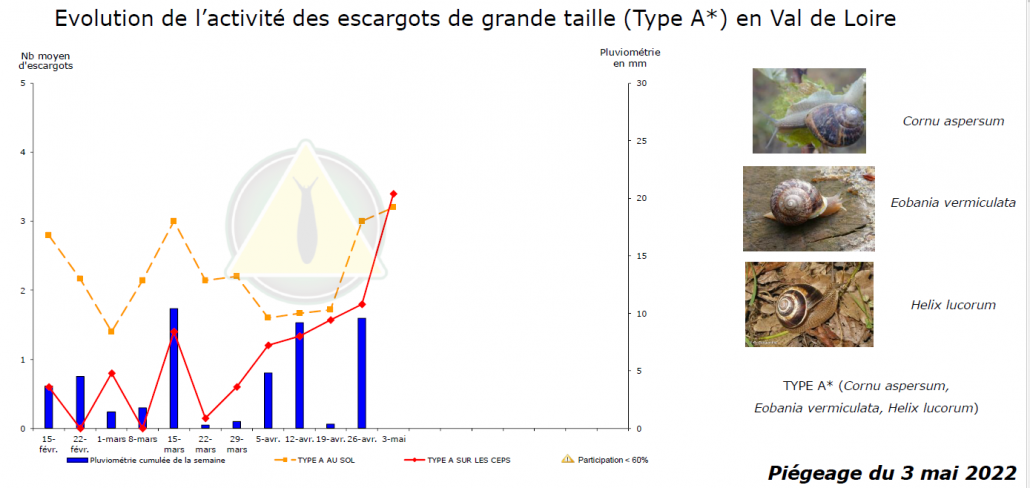 Malgré le retour d’un temps plutôt sec, les piégeurs de l’OBSERVATOIRE détectent toujours une forte activité escargots dans les parcelles de vigne à la fois au sol et sur les ceps.