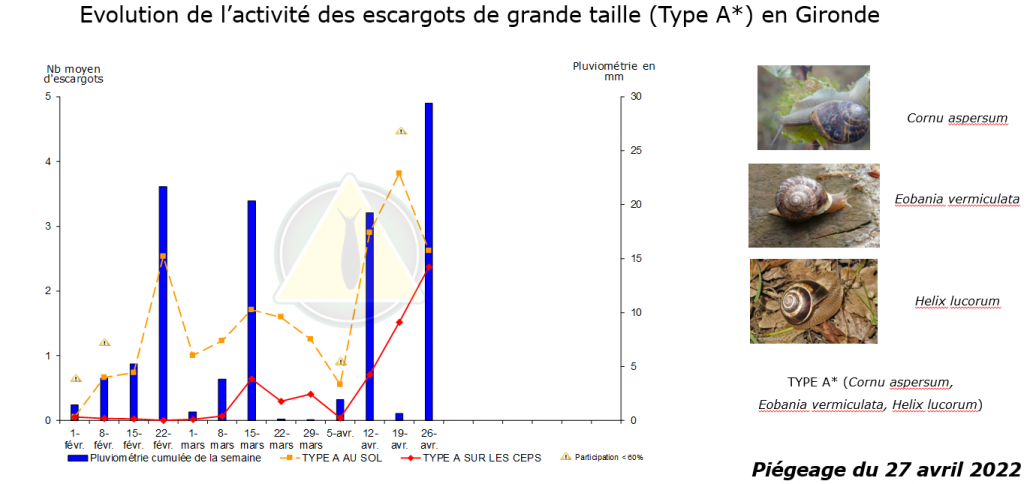 Même si les piégeurs de l’OBSERVATOIRE constatent encore de nombreux escargots au sol, ils notent une forte progression de leur présence sur les ceps.