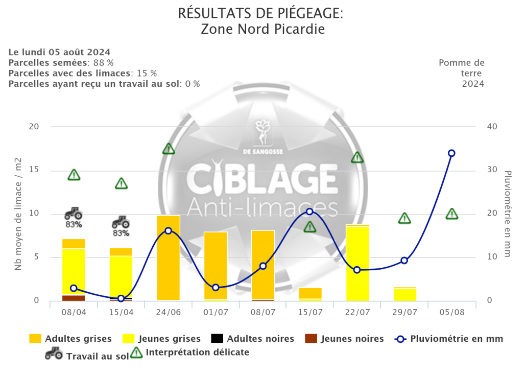 Le temps estival qui règne sur une majeure partie de la France, n’est pas étranger à cette absence du ravageur sous les pièges. En revanche, si des précipitations avaient lieu localement, il pourrait y avoir une reprise d’activité des jeunes limaces, car les stocks de populations sont hauts. Attention aux attaques sur tubercules.