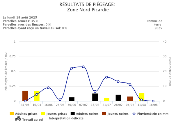Ces conditions pourraient réactiver l’activité des limaces, notamment dans les cultures souterraines. Il est donc recommandé de maintenir le piégeage et de consulter les données de l’Observatoire.