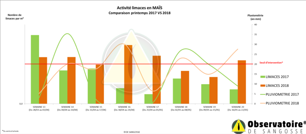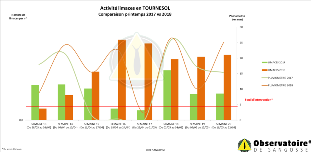 Les deux schémas ci-dessous montrent que sur les cultures de maïs comme de tournesol, la pluviométrie élevée par rapport à l’année dernière provoque une augmentation de l’activité et des dégâts de limaces dans les parcelles.