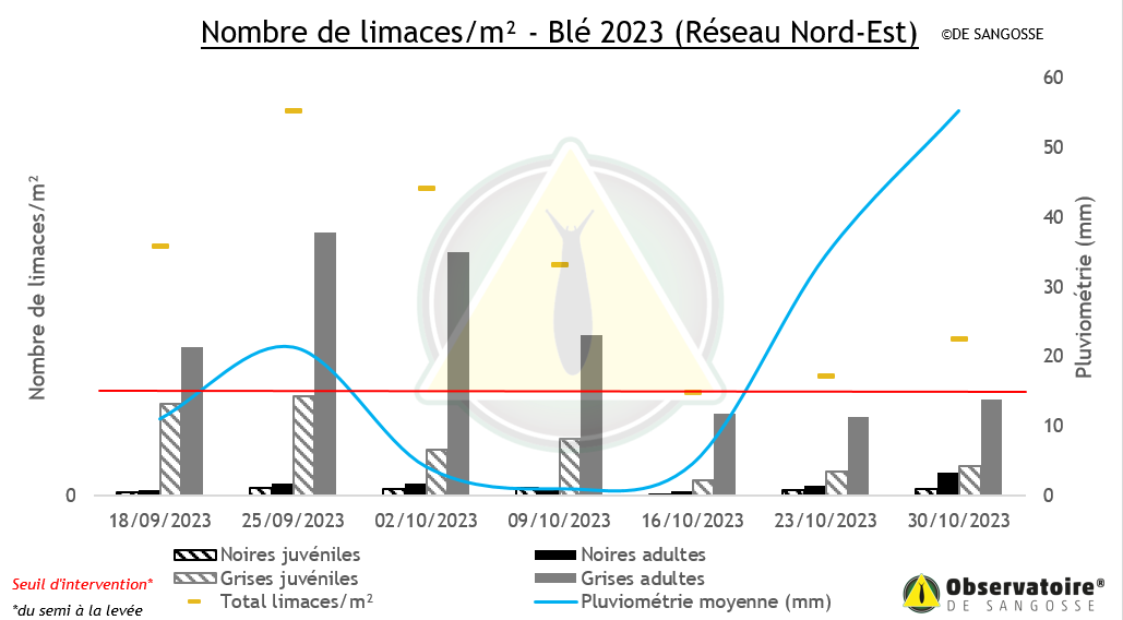 63 % des parcelles des secteurs Ouest et Sud ont été semées. Les autres sèmeront prochainement, car ralenti par les pluies. Cependant, la terre est bien chaude, les blés semés poussent vite ! Jeudi dernier, la Bretagne et le Poitou-Charentes étaient en alerte rouge pour une quantité de 9 limaces par m² en moyenne.
