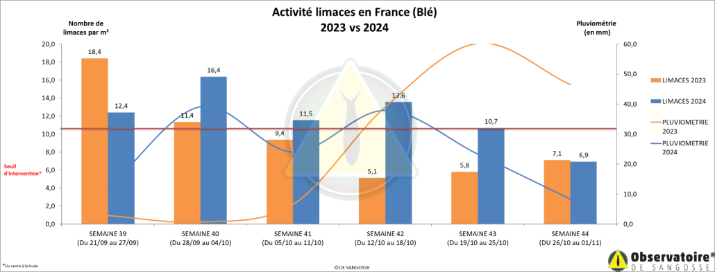 En revanche, l’activité moyenne globale est de 7 limaces par m², ce qui confirme le ralentissement global d’activité, détecté la semaine dernière.