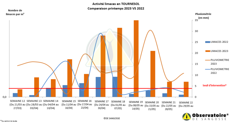 L’année 2023 pourrait être qualifiée d’année à limaces. Le bilan de la campagne sera prochainement communiqué, mais le graphique national ci-dessous montre bien la différence de pression qu’a exercé le ravageur en 2023 par rapport à l’année 2022. Alors si les dernières observations ont dénombré moins de limaces, le ravageur a bien été actif ce printemps. Il faudra être vigilant pour les prochains semis !