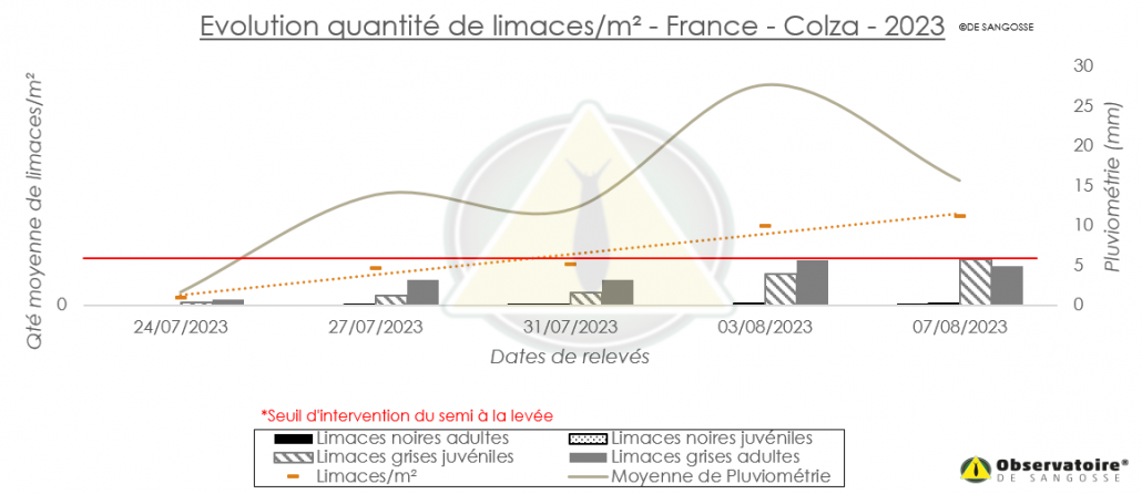 A contrario, en Normandie, les agriculteurs ont dû repousser les relevés car certain n’ont pas pu moissonner en raison des intempéries. Cependant un piégeur de la zone a observé 6 limaces/m² sur sa parcelle !