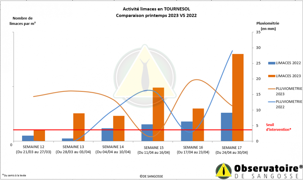 Pour la culture de tournesol, le seuil est dépassé sur les zones Poitou-Charentes et surtout le Centre avec 23 limaces par m² en moyenne.
