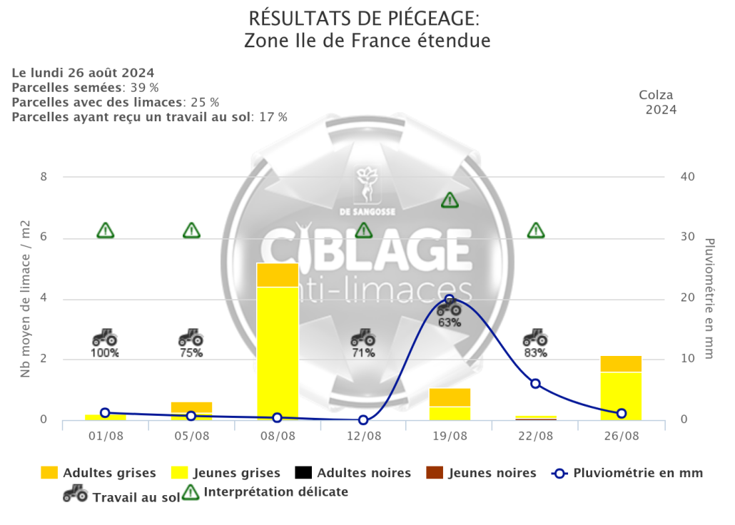 Prenons l’exemple de la zone Ile de France. L’activité moyenne relevée hier est de 2 limaces par m² avec un nombre de parcelle touchées qui passe de 17% à 25% après quelques gouttes de pluie. Cela montre bien comment l’activité des limaces peut évoluer rapidement si des précipitations ont lieu.