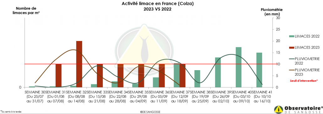 Même avec une pluviométrie moyenne de 1 mm, la quantité de limaces par m² au niveau national, passe tout juste en-dessous du seuil de risque. C’est une baisse légère, compte tenu des conditions et un quart des parcelles de l’OBSERVATOIRE DE SANGOSSE sont infestées. Du coup, la plupart des zones restent en alerte.