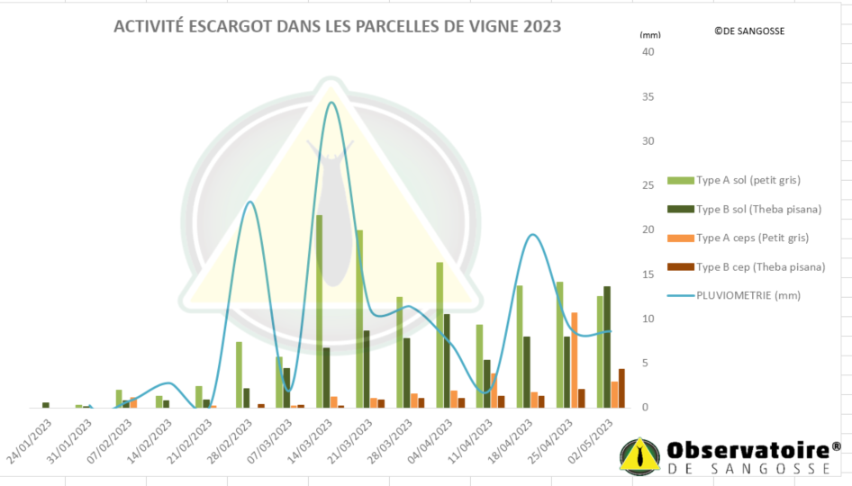 Même si certaines vignes ont dépassé le stade > 3 feuilles, les piégeages continuent dans le réseau de l’OBSERVATOIRE DE SANGOSSE, car les populations d’escargots sont nombreuses. En effet, la présence au sol et en nombre des individus, offre toujours une opportunité d’intervention* afin d’éloigner le risque de dégâts.