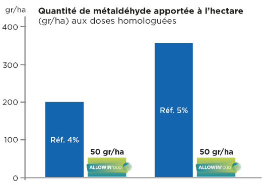 La synergie créée par l’association des 2 matières actives permet de réduire de 4 à 7 fois la quantité de métaldéhyde à l’hectare. En même temps, cette synergie apporte une efficacité nouvelle génération.
