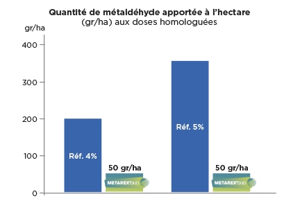La synergie créée par l’association des 2 matières actives permet de réduire de 4 à 7 fois la quantité de métaldéhyde à l’hectare. En même temps, cette synergie apporte une efficacité nouvelle génération.