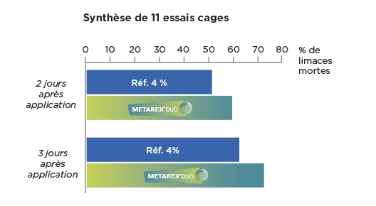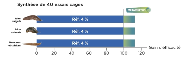 En effet, METAREX® DUO apporte 10 % d’efficacité supplémentaire quelles que soient les limaces et les conditions présentes dans la parcelle par rapport à la référence.